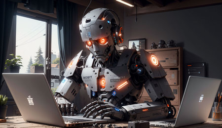 Robot hands using laptop computer typing top angle view artificial intelligence digital futuristic technology concept flat horizontal.
