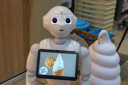 Osaka / Japan - October 6, 2017: Cute humanoid robot at ice cream shop in Osaka, Japan