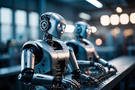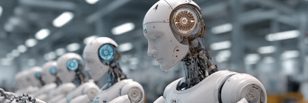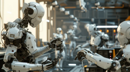 Humanoid robots work together in a modern factory, highlighting technological advances in automation and robotics.