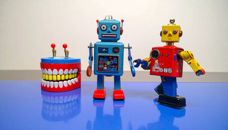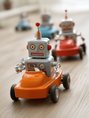 Brightly colored vintage toy robots on small carts race across a wooden floor, creating a fun and lively atmosphere in the room.