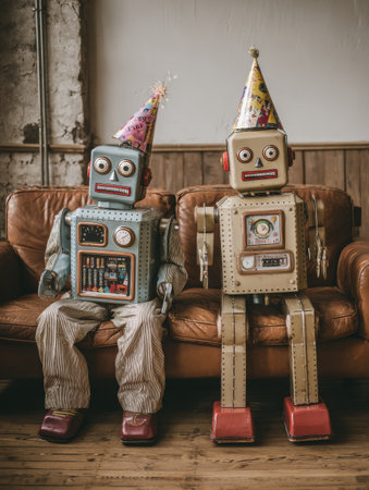 Vintage robots with party hats sit on a couch, creating a cheerful atmosphere in a rustic room during a birthday celebration.