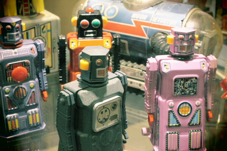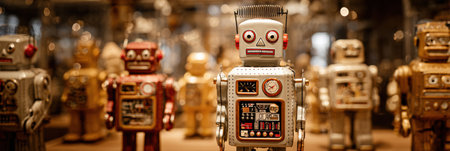 A collection of vintage robot toys stands on display, highlighting their charming designs and intricate details in a nostalgic setting.