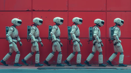 A group of humanoid robots walk in perfect synchronization beside a red wall, symbolizing technology and automation. Futuristic scene depicting advanced robotics and artificial intelligence.