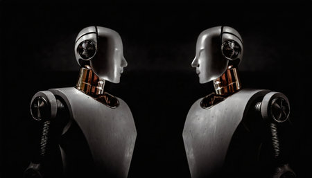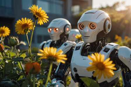 This image features two futuristic robots with human-like characteristics, showcasing advanced technology and innovative design in a sleek, artistic manner suitable for various creative projects.