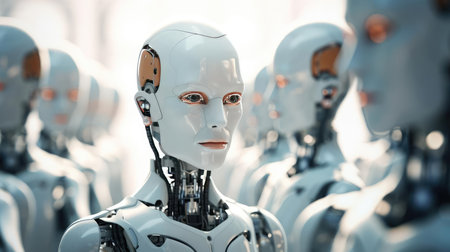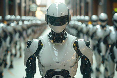 Row of humanoid robots lined up in a modern facility, showcasing advancements in technology and artificial intelligence.