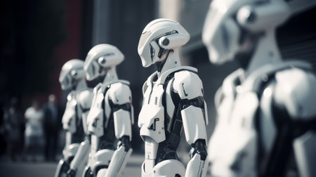 a group of robots walking down the street in a modern city of the future against a blurred background.