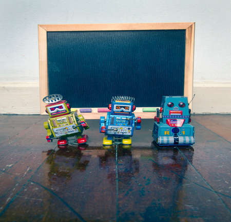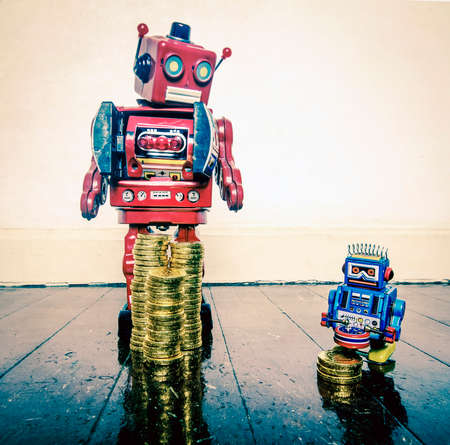 rich man poor man concept with retro robots on a old wooden floor with reflection