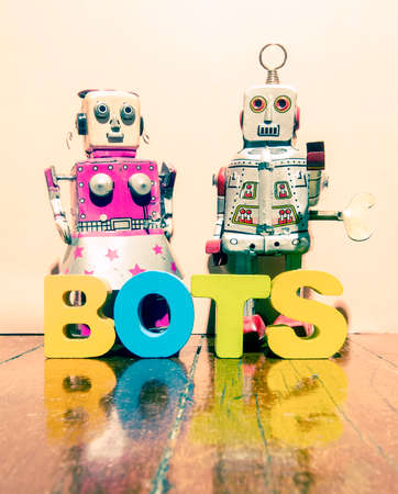 the word PROGRAMMING with wooden letters and retro toy robots on an old wooden floor with reflection