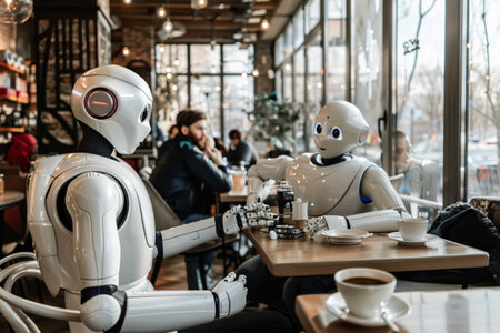 Two robot sitting in bright cafe and talking to each other with cup of coffee