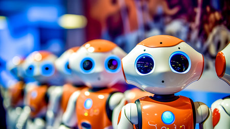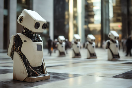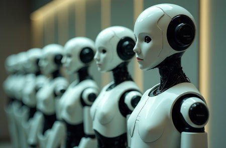White service robots standing in an orderly line within a contemporary interior, representing automation and future technology
