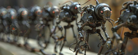 A fantasy scene of clockwork creatures marching in a line, ticking in perfect harmony