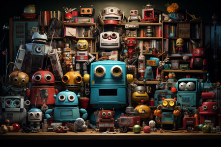 Vintage toy robots sit on a shelf with colorful books and plush characters in a cozy setting.