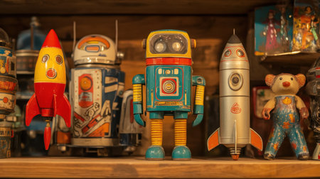 A set of nostalgic vintage tin toys, featuring a colorful robot, a metallic rocket ship, and a tin animal, all carefully arranged on a shelf.
