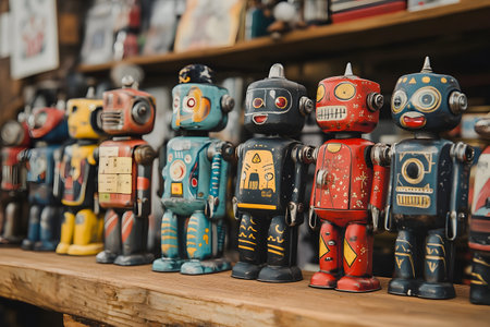 Colorful vintage robots stand proudly on a wooden shelf, inviting nostalgia and creativity.