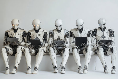 Five humanoid robots in a row, each holding a tablet, against a plain white background
