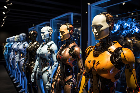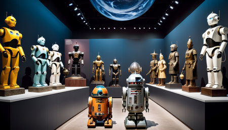 An exhibit showcasing a diverse collection of classic sci-fi robot figures, displayed in a modern museum setting.. AI Generation