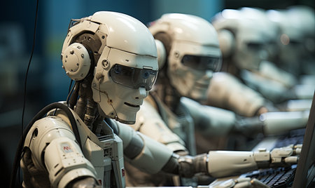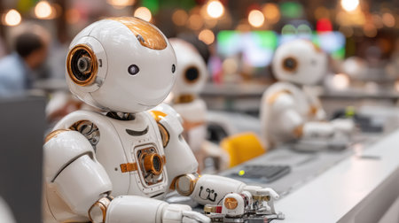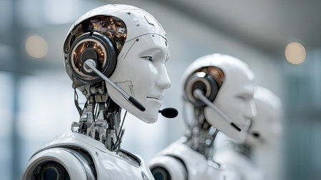 This image features futuristic robots equipped with headsets, representing the intersection of technology and artificial intelligence in a sleek, modern space.
