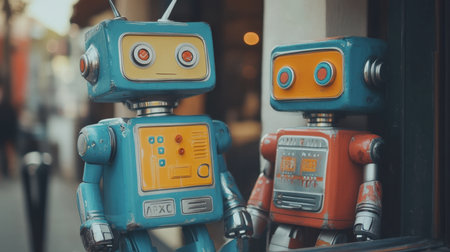 Two retro robots with bright colors stand outside, showcasing a nostalgic charm. Their unique design captures a playful essence, bringing joy and creativity.