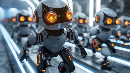 A modern robot with illuminated eyes on an assembly line with a series of identical units in a high-tech manufacturing facility.