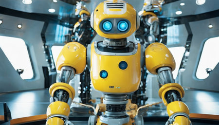 A service robot with expressive blue eyes stands ready in a high-tech facility, symbolizing cutting-edge automation and AI.. AI Generation