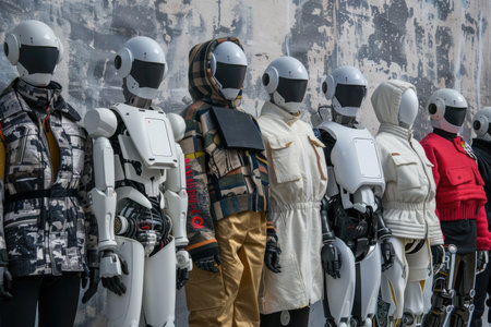 A group of robots are lined up in a row, each wearing a different outfit. The robots are all white and have a futuristic appearance. The outfits are colorful and unique, with some featuring pockets