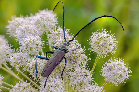 Very large beetle with long mustaches sits on the inflorescence of the cow grouse