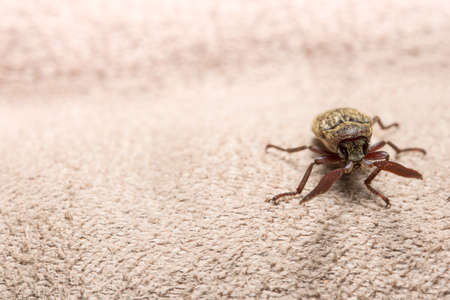 Close-up of dead black beetle (Capnodis tenebrionis) on flooring in house. Pest control concept. Extermination.