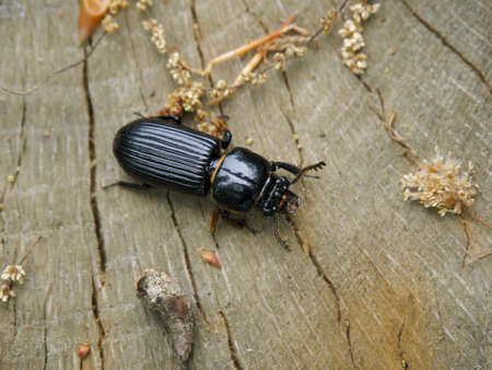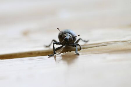 Black beetle crawling on the edge of the table