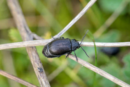 Closeup of violet oil beetle in natural environment. Meloe violaceus