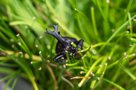 The beautiful dynastic beetle , male , perched on leaf. Selective focus. Leaves background