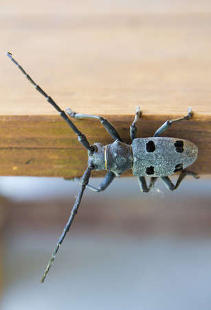 Portrait of a capricorn beetle (Cerambyx scopolii, Cerambycidae) sitting on a tree trunk (Vienna, Austria)
