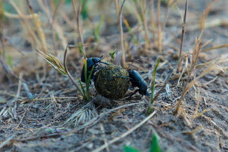 Family of two beetles on the ground among the grass roll a manure ball in the sunny summer or spring weather. The symbol of collective job, reproduction and shipment