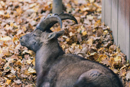 The maned ram eats hay, animal in the zoo, large rounded horns of ram.