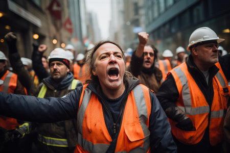 Group of protesters with their fists raised up in the air. Activists protesting on the street. People publicly demonstrating opposition. Gloomy city scenery. Generative AI.