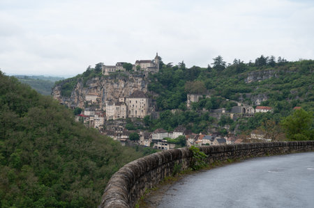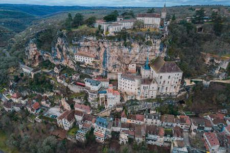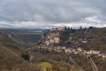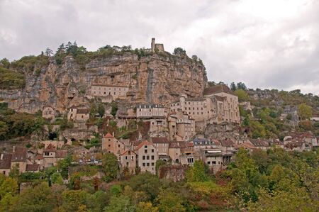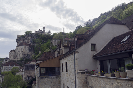 Rocamadour medieval village located on pilgrims route in Lot department in southwestern France, attracted visitors for its setting in gorge above tributary of River Dordogne, panoramic view in rainy day