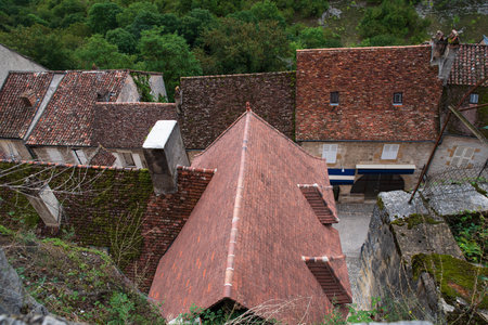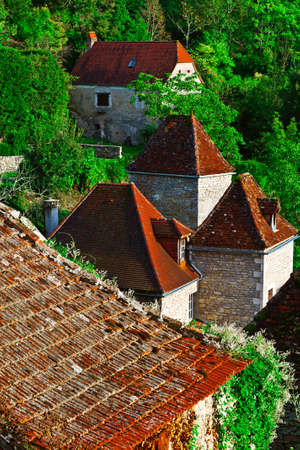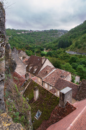 Houses in the town of Rocamadour seen from above, with their roofs, the valley and the forest
