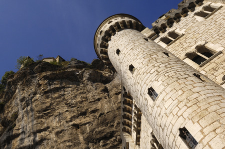 Stone walls of historic Basilica of St-Sauveur blend into the cliff in Rocamadour, France