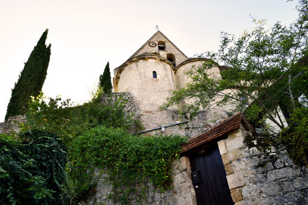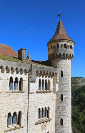 Rocamadour, France - September 3, 2018: Stone walls of historic Basilica of St-Sauveur blend into the cliff in Rocamadour, France