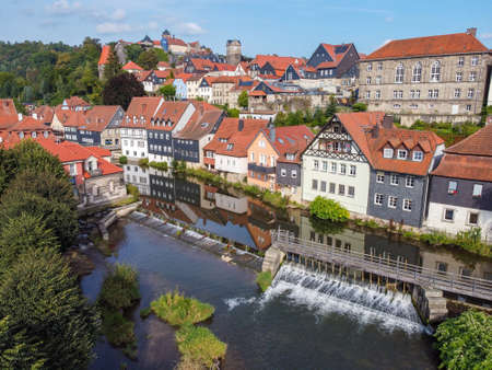 KRONACH, GERMANY - CIRCA APRIL, 2019: Townscape of Kronach with Haßlach river in front of fortress Rosenberg, Bavaria, Germany