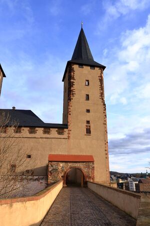 Towers of the medieval castle in Rochlitz/Saxony/Germany in Europe with blue sky and white clouds