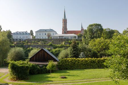 View on minor basilica in Grybow, Beskid Sadecki, Poland. Horizontal crop in sunny day with blue sky.