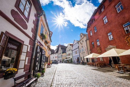 Krumlov, Czech Republic - 21 September 2018: Sunshine view of Cesky Krumlov wide street with beautiful architecture around