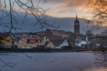 Telc old historical town in winter frosty morning before sunrise with blue sky
