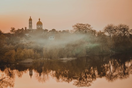 landscape church river fog at dawn, sunset