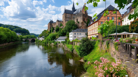 This captivating image showcases a medieval castle perched on a hillside, beautifully reflected in the calm river below, surrounded by lush greenery and vibrant buildings.