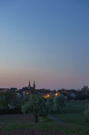 Morning dawning outside a german village with church on meadow with blooming trees