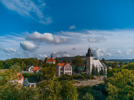 Aerial view of Scharfenstein village and castle in the Ore Mountains, Saxony, Germany