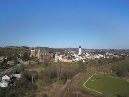 Panorama of the ancient Polish city of Bech. Aerial photograph taken from a bird's flight shot by a quadrocopter or drone. Tourist place of medieval Carpathians architecture.