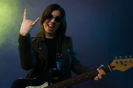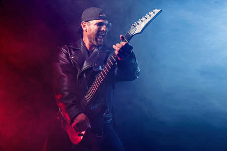 Brutal bearded Heavy metal musician in leather jacket and sunglasses is playing electrical guitar. Shot in a studio on dark background with smoke