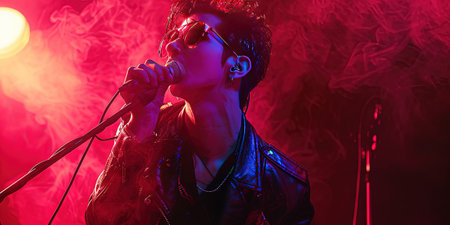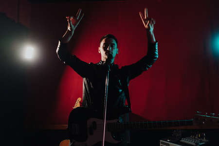 Rock band vocalist with the guitar singing to microphone with the hands raised up in lights on red background